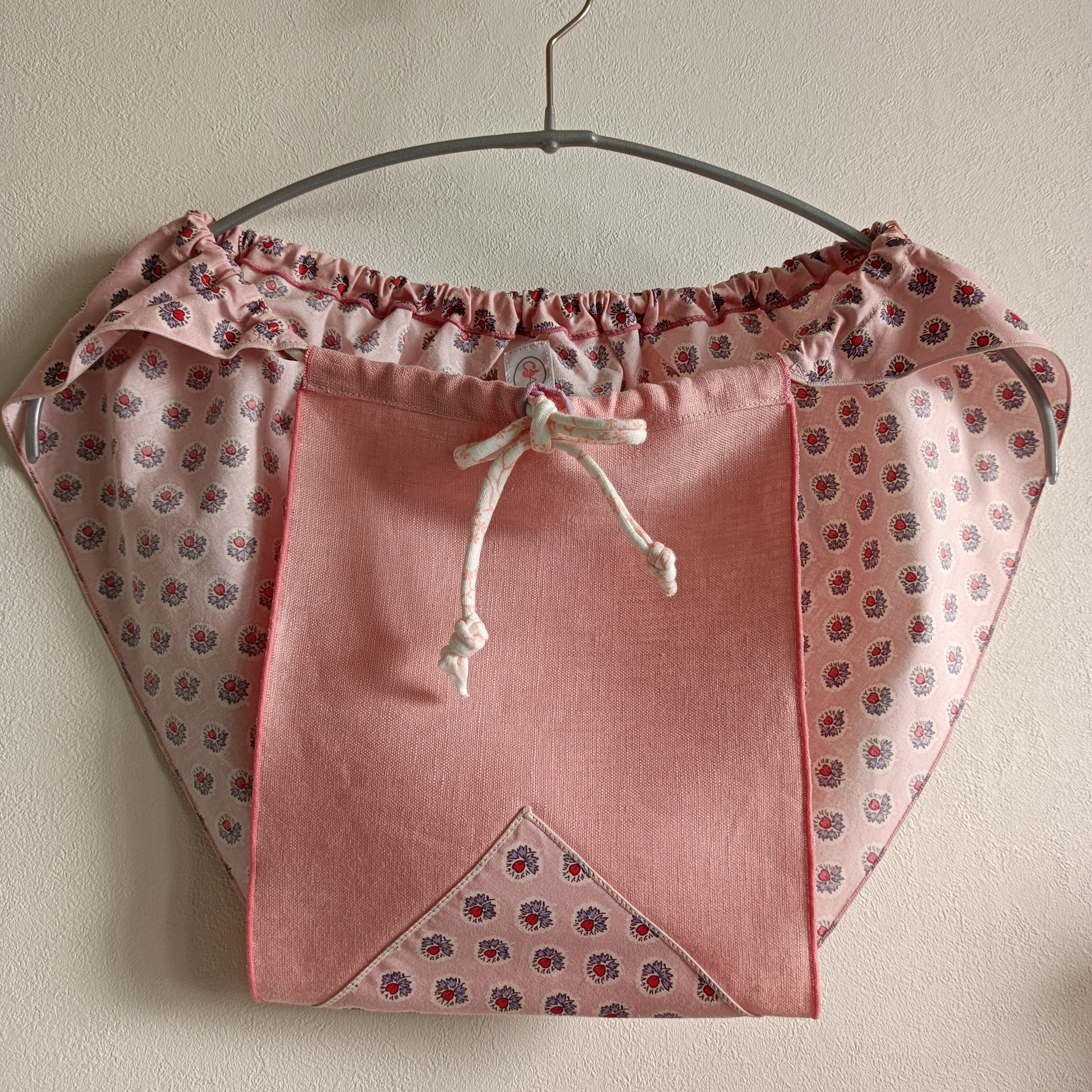 肝心な所には丈夫なリネン生地、お尻部分は柔らかくかわいいプロバンスプリント生地、紐には伸縮性のあるTシャツヤーンを使用。