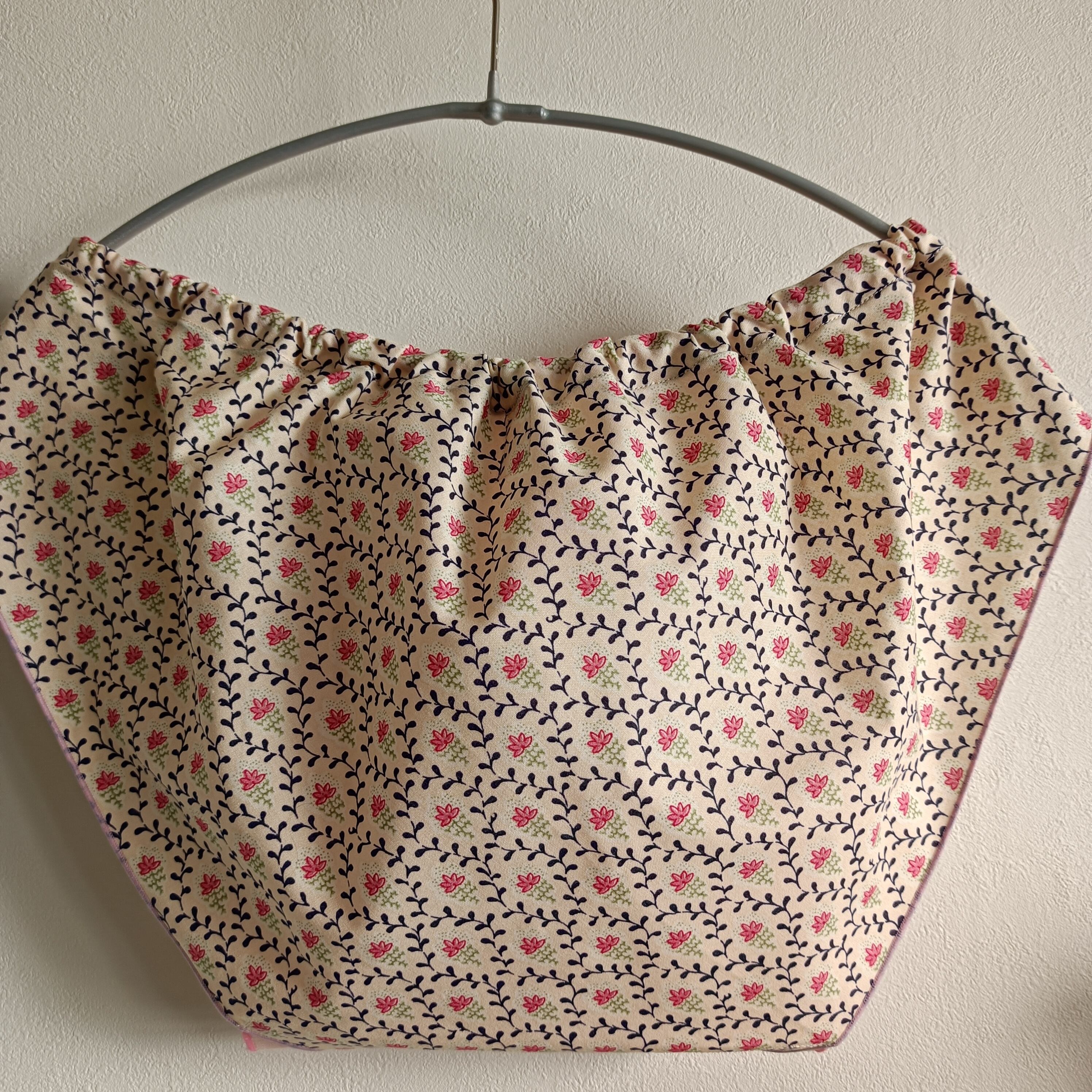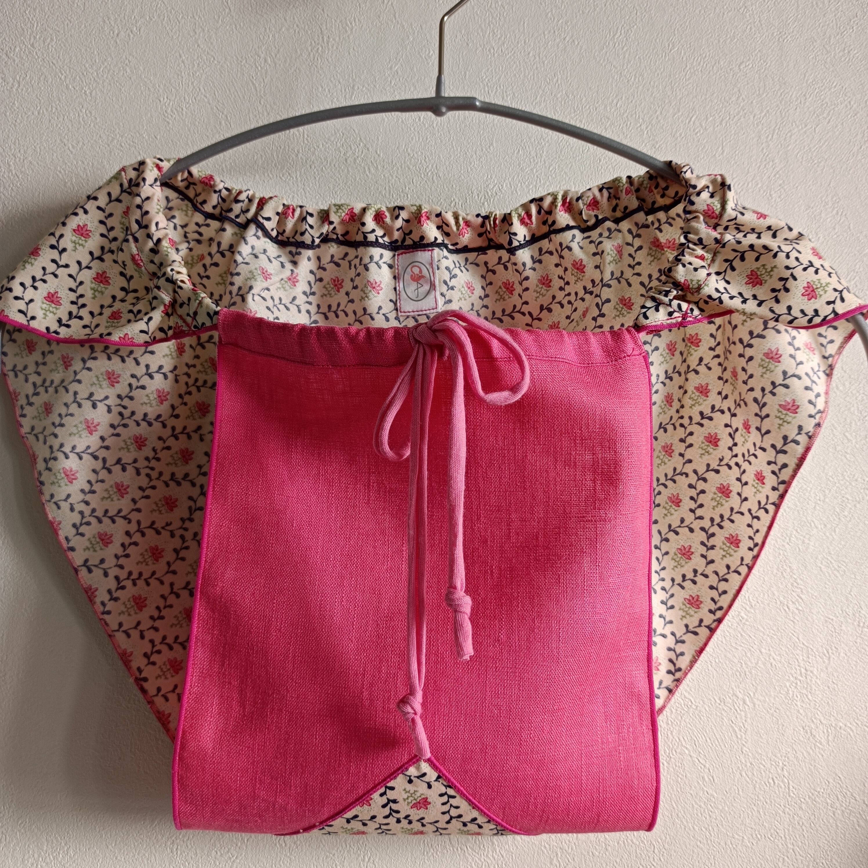 肝心な所には丈夫なリネン生地、お尻部分は柔らかくかわいいプロバンスプリント生地、紐には伸縮性のあるTシャツヤーンを使用。