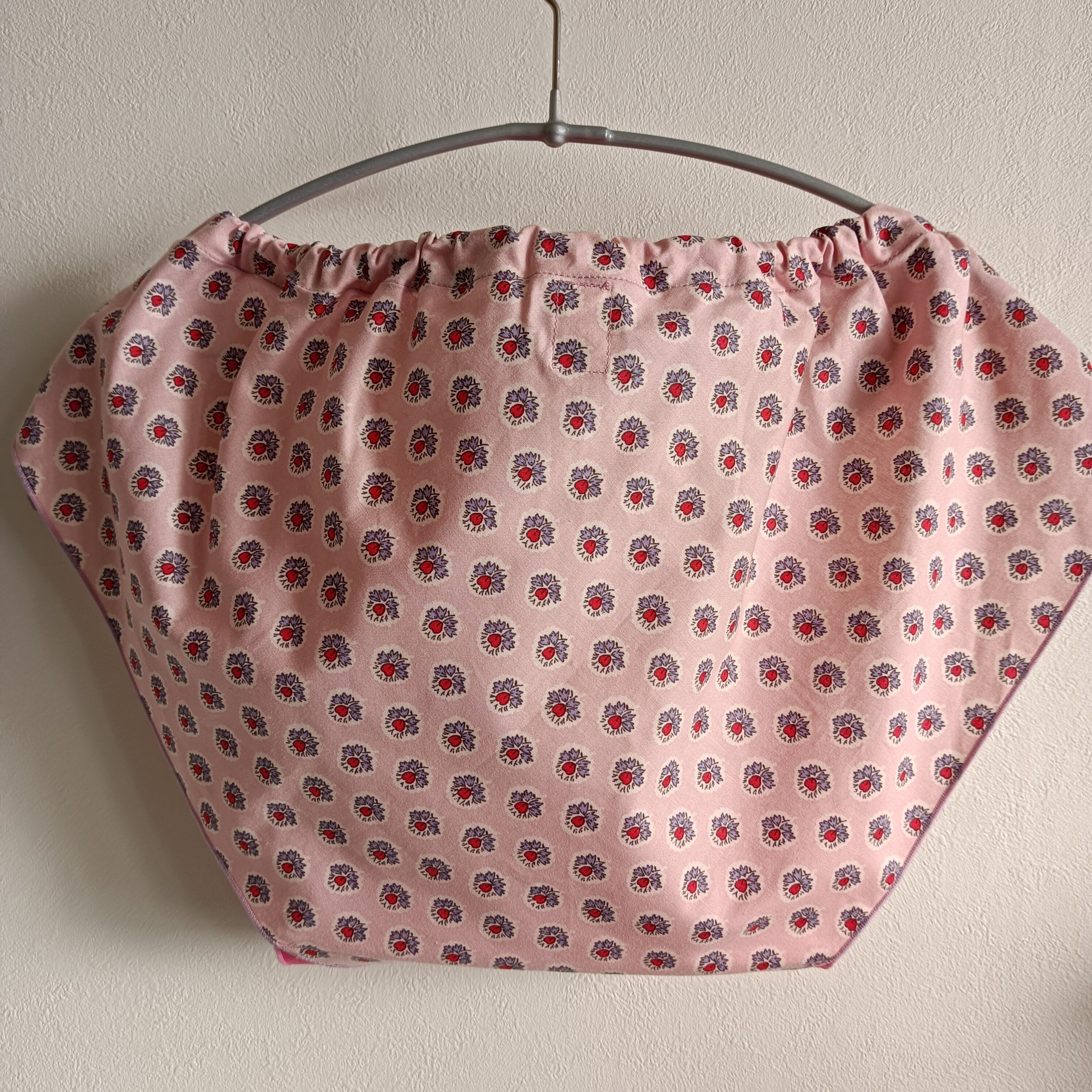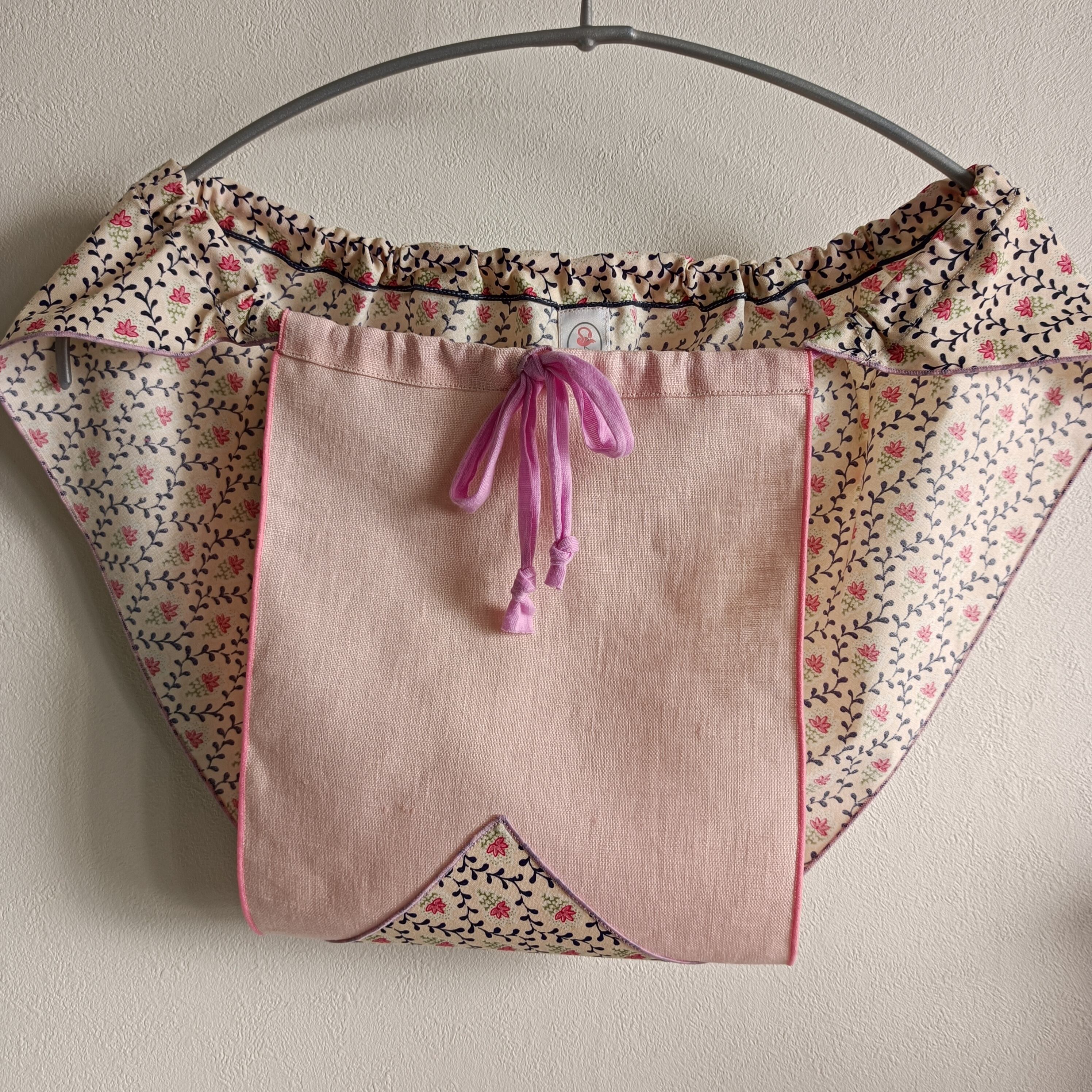 肝心な所には丈夫なリネン生地、お尻部分は柔らかくかわいいプロバンスプリント生地、紐には伸縮性のあるTシャツヤーンを使用。